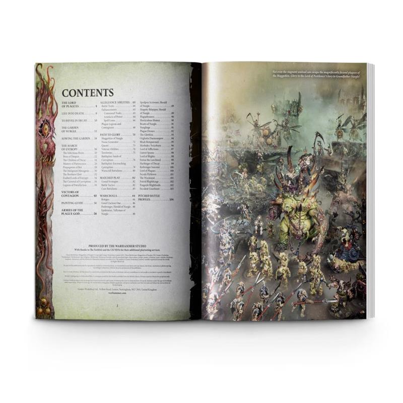 - A pestilent bounty of lore and background information all focussed on Grandfather Nurgle and the daemons and mortals that live only to spread his poxes