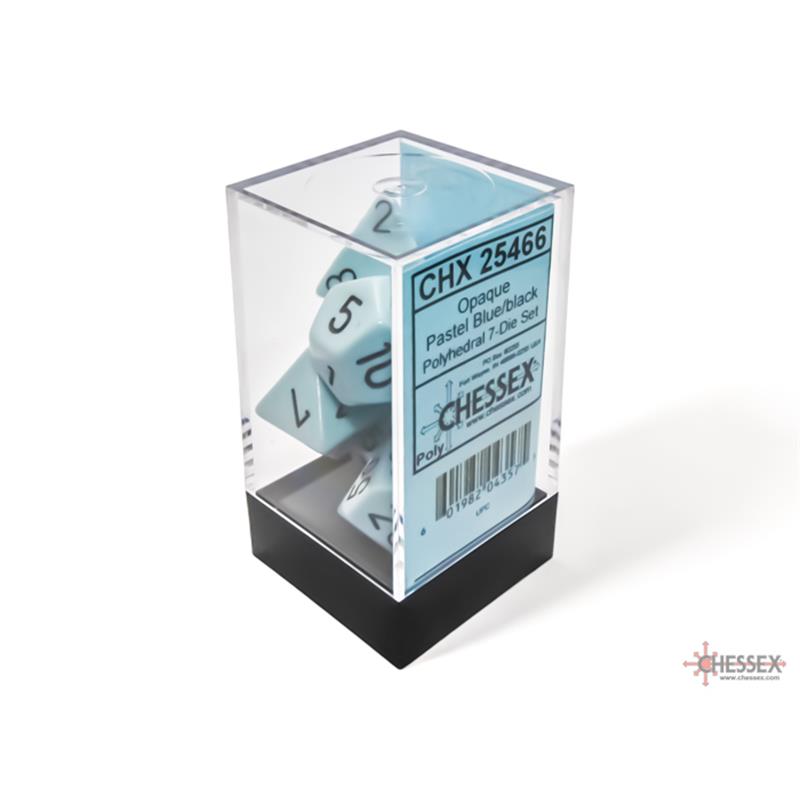 This set contains 7 Opaque Pastel Blue dice with black numbers with the following shapes: