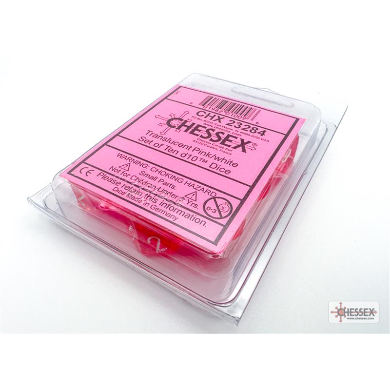 Contains 10 Translucent Pink d10 dice with white numbers (PT1084) in Plastic Clamshell