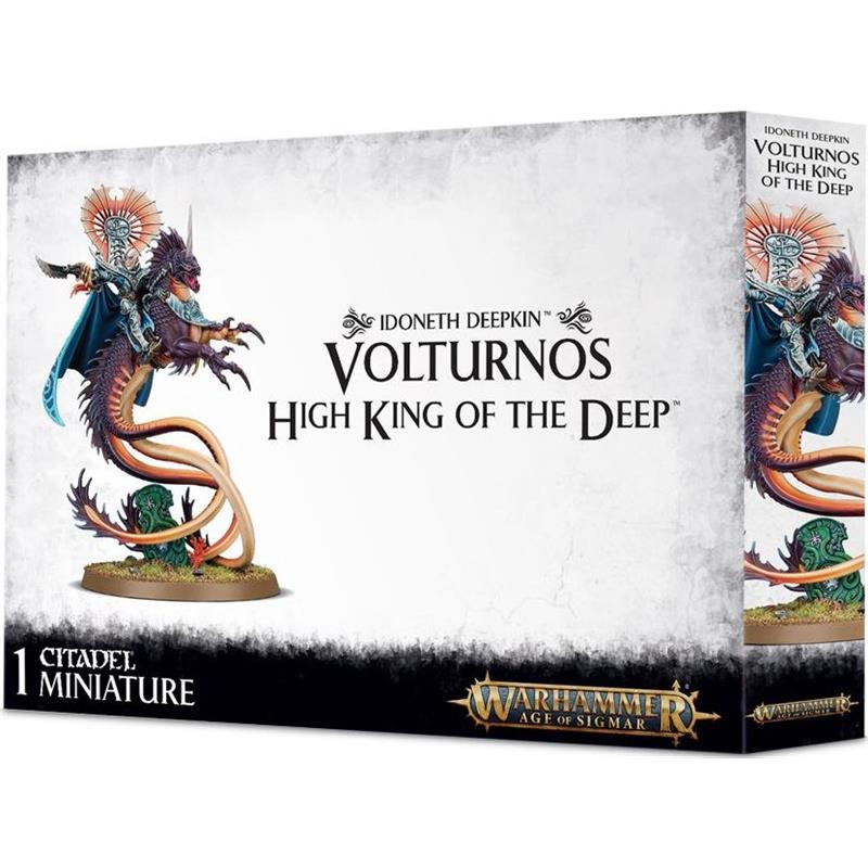 Questo kit multicomponente di plastica contiene le parti necessarie per assemblare Volturnos, Sommo Sovrano degli Abissi. È indiscutibilmente pronto alla guerra e indossa una splendida e pesante armatura a piastre (spiccano soprattutto gli schinieri e gli spallacci, che si estendono ben oltre le spalle di Volturnos e sorreggono un enorme mantello impreziosito da simboli Idoneth lungo i bordi). Nella mano destra guantata impugna l'Astra Solus, una lama seghettata dall'aspetto letale, e con la sinistra sorregge Cealith, lo scudo del Sommo Sovrano. Sopra alla testa rasata e il volto parzialmente nascosto da una benda sull'occhio, si innalza l'Emblema dei Sommi Sovrani, un alto e maestoso stendardo, che reca simboli idoneth incisi nel metallo e grossi gioielli. La sua cavalcatura, Uasall, è un famoso Deepmare, distinguibile dagli altri per il corno ancora più grande: è una gigantesca creatura ricoperta di squame le cui zampe anteriori terminano in enormi artigli, mentre il quarto posteriore si divide in tre code poderose. Il kit include una pietravia aelfica per aggiungere atmosfera alla basetta.