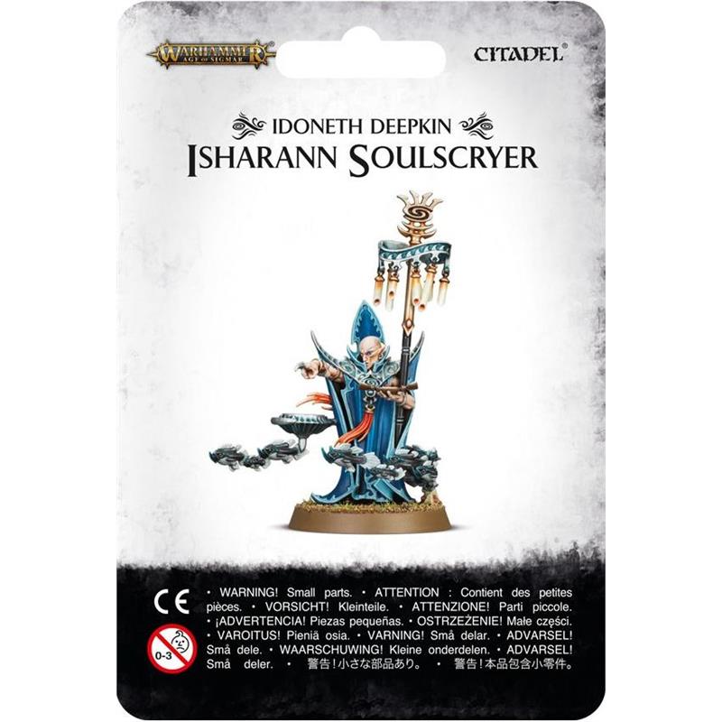 This multi-component plastic kit contains all the pieces necessary to assemble an Isharann Soulscryer. Wrapped in luxurious robes, with a large collar and a headdress that clearly indicates his priestly origin, he is a model with a determined appearance. The garments are held together by large metal pauldrons, which also protect his back, ending in two tips covered with Idoneth engravings. The head is shaved, and the ears are adorned with earrings; the ornaments are completed with metal bracelets. He carries a cyfar compass, a round object attached to his cloak, and the dowsing bells, which hang from a long staff held in his left hand that ends with a complex Idoneth rune. Around his legs dart 9 Scryfishes, which follow the direction indicated by his right hand.