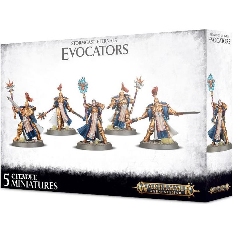 This multi-part plastic kit contains the necessary parts to assemble 5 Stormcast Eternals Evocators. Each is clad in Stormcast Eternals armor, featuring a cloak, tabard, and ornate helm that denote their status as Sigmar's assault troops. The body is adorned with the symbol of the Sacrosanct Chamber, the tripartite anvil. Each can be armed with a combination of stormblade and stormstaff or a two-handed greatstaff. There are options for an Evocator-Prime (who can be either male or female) that can be assembled either unleashing magical lightning or with one hand to their head, focusing on a particularly powerful spell. One model can be assembled as a Knight-Incantor, complete with a splendid beard and hair blown by the wind as they point defiantly at the enemy in an intimidating stance.
