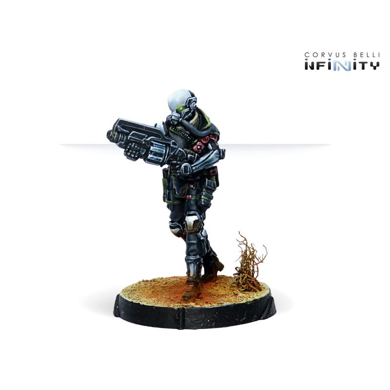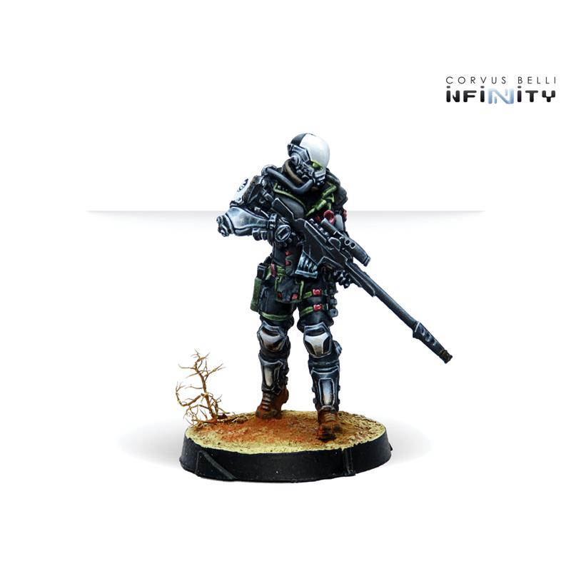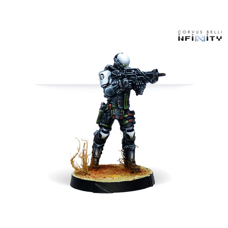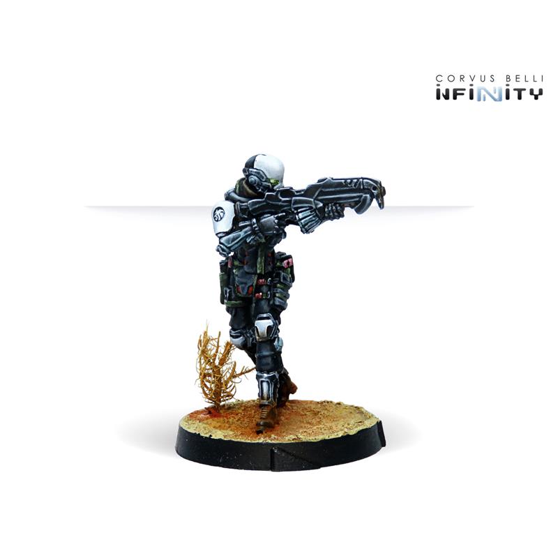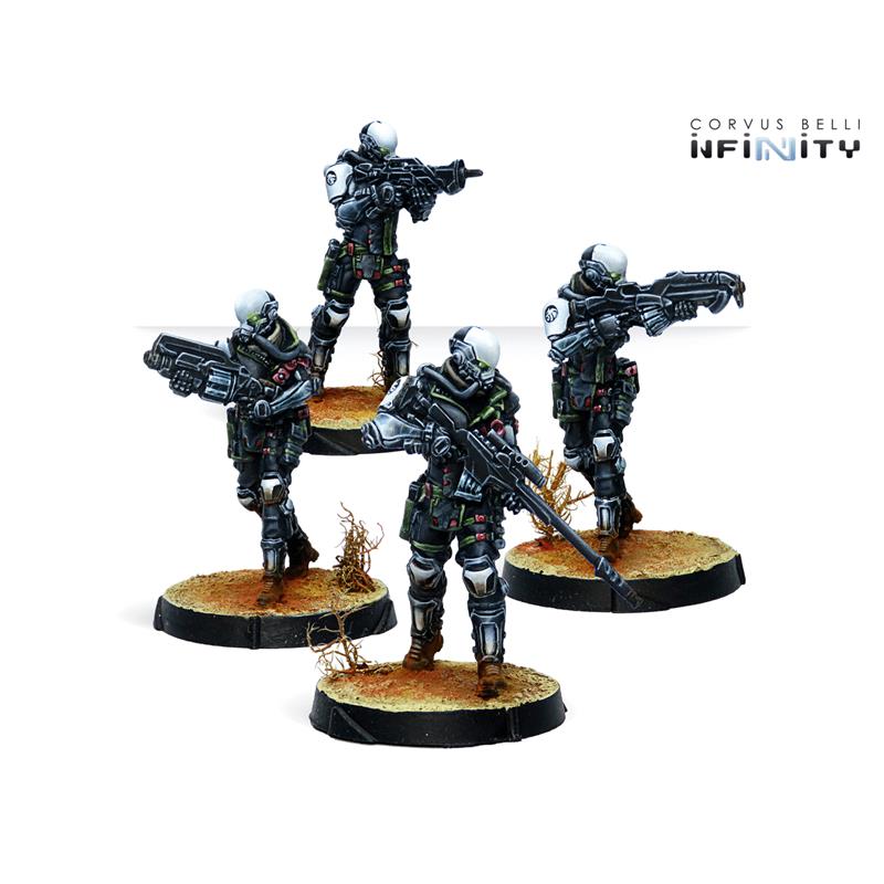 This box includes four miniatures: one Kaplan with Combi Rifle, one Kaplan with MULTI Sniper Rifle, one Kaplan with Spitfire and one Kaplan with Adhesive Launcher. With this box we can strengthen our Haqqislam Sectorial Army of Qapu Khalqi or the NA2 Foreign Company Army.