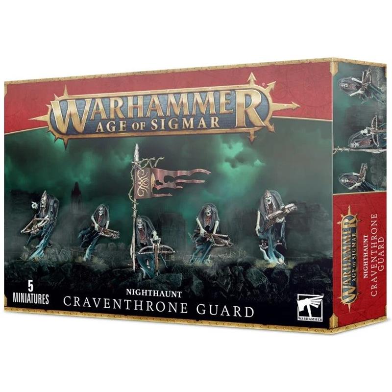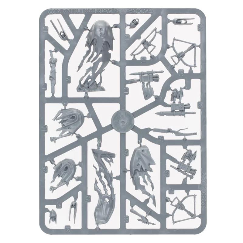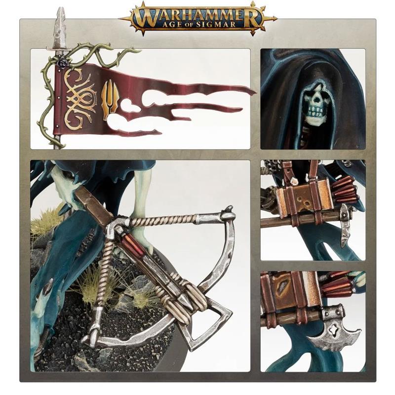 With this multi-component plastic kit, you can assemble five Coward's Throne Guards, each armed with a Soul Hunter crossbow to unleash a hail of lethal short-range darts. The kit includes options to assemble a Coward's Head Hunter and a Spectral Standard Bearer. Each model can be assembled with a hooded head or a helmet, and you can use other components like decaying quivers to add variety and customize your units.