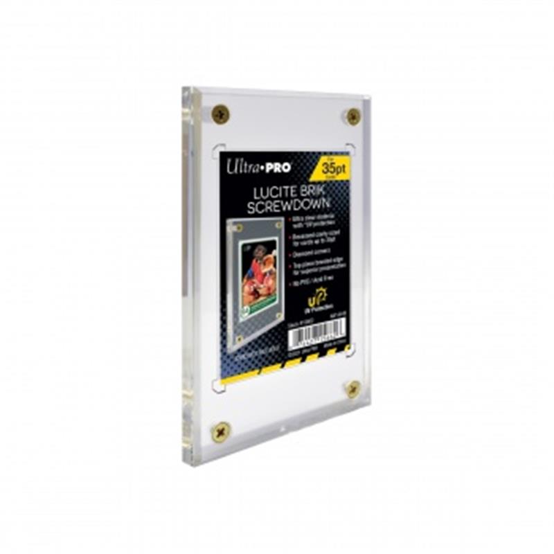 The Lucite Brik Screwdown features a 35pt recessed area with diamond corners and is designed to hold standard cards 2-1/2' x 3-1/2". Superior quality Lucite slabs with four-screw closure on each corner and beveled edges for a premium look. Lucite has special additives to protect your valuables from harmful UV rays. Can be displayed vertically or horizontally.