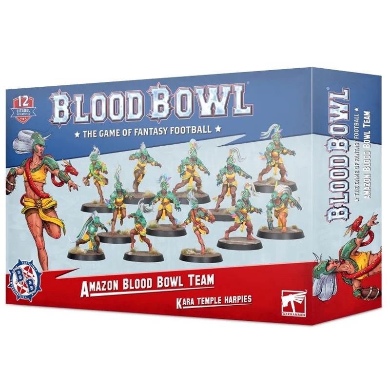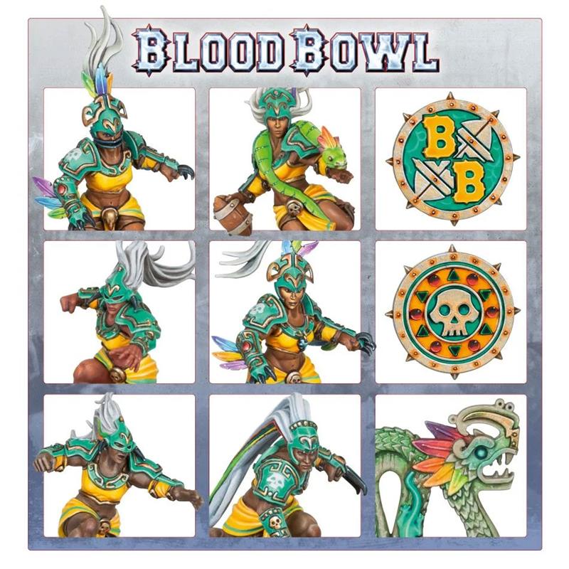 This multi-part plastic kit allows you to assemble the Kara Temple Harpies, an Amazon team to use in your Blood Bowl matches. The team consists of 6 Eagle Warrior Linewomen, 2 Piranha Warrior Blitzers, 2 Python Warrior Throwers, and 2 Jaguar Warrior Blockers. Additionally, the box includes two double-sided Blood Bowl coins, 2 turn and re-roll markers, 4 balls, and a transfer sheet with 292 Amazon team-themed symbols.
