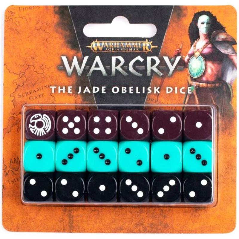 – 6x dadi turchesi a sei facce con bordi smussati che misurano 16mm di lato, con puntini neri e l'icona dell'Obelisco di Giada al posto del 6