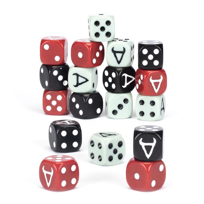 – 6x black six-sided dice with rounded edges measuring 16mm per side, featuring white pips and the icon of the Horns of Hashut in place of the 6