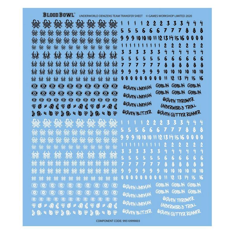 With this multi-part plastic kit, you can assemble a Blood Bowl Underworld Denizens team consisting of 12 players. By using components from the Goblin and Skaven team sets, you can assemble 6 Goblin Linemen, 3 Skaven Clanrats, 1 Skaven Blitzer, 1 Skaven Thrower, and 1 Skaven Gutter Runner. Some of these players include decorative options like different heads to help you customize your team. The box also includes six balls, two double-sided Blood Bowl coins, and two turn markers (split equally between Skaven and Goblin designs) and a transfer sheet for the Underworld Denizens featuring team logos, numbers, and roles.