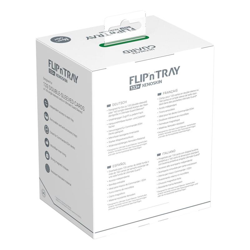The latest version of Ultimate Guard's legendary Flip'n'Tray offers even more space: The Flip'n'Tray 133+ Xenoskin fits up to 133 double-sleeved cards, thanks to the integrated extra compartment for dice, the deck box is perfect for Commander/EDH decks and is the optimal companion for Magic: The Gathering players at Limited Events. But fans of other TCGs like Pokémon or Flesh and Blood will also love the spacious and practical deck box with our proven Xenoskin surface!