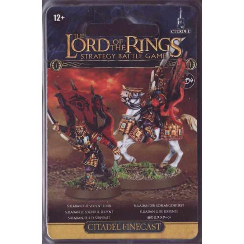 The package contains Suladan the Serpent Lord on foot and mounted, a finely detailed resin kit with 8 components, including 1 25mm round base and 1 40mm round base. The miniature must be assembled and painted. We recommend using cyanoacrylate glue and Citadel paints.